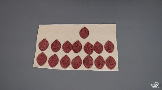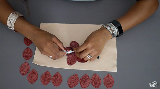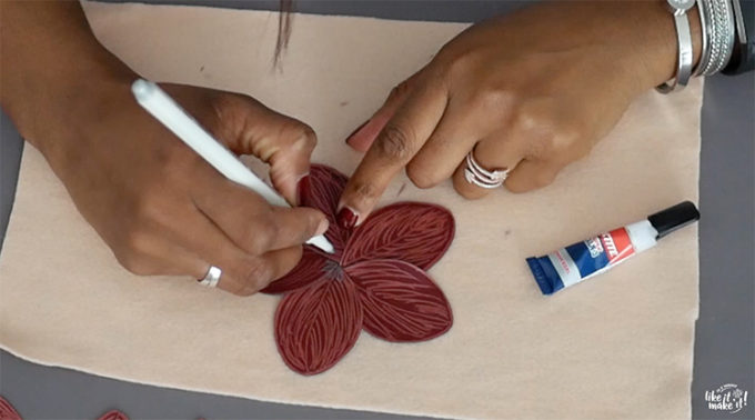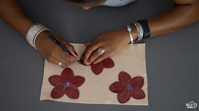 Ensuite, placez les pétales pour former les fleurs. Là encore, la vidéo montre bien comment le faire et solidariser les pétales avant d’appliquer la colle. Après cela, avec un marqueur de couleur différente, dessinez le coeur des fleurs.
