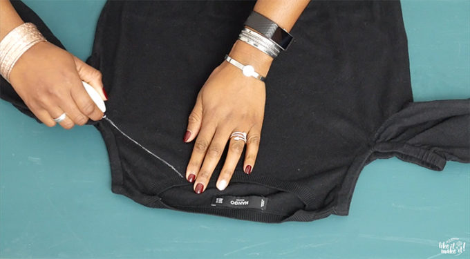 Pour commencer, placez votre main sur le haut du top et tracez un premier trait au bout des doigts, puis le deuxième à l’autre extrémité et reliez-les.