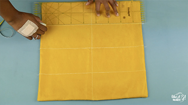 D’abord, tracez un trait vertical au milieu du coussin, puis divisez en quatre parties égales sur l’horizontal. Ensuite, en vous aidant des traits horizontaux, dessinez les feuilles à la craie.
