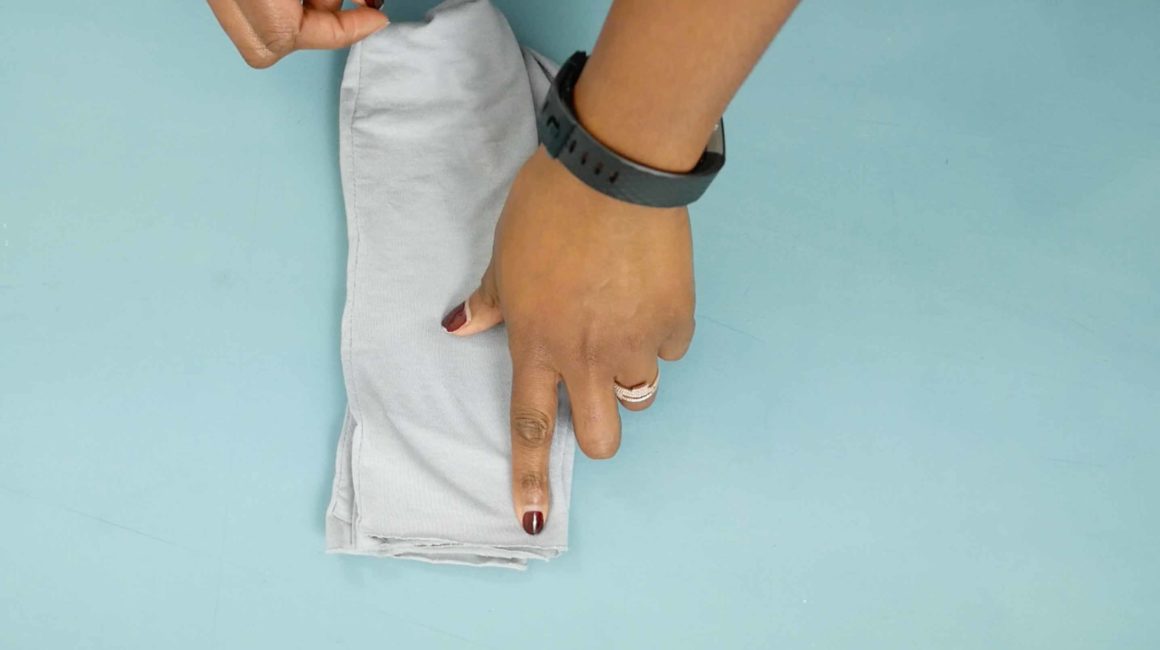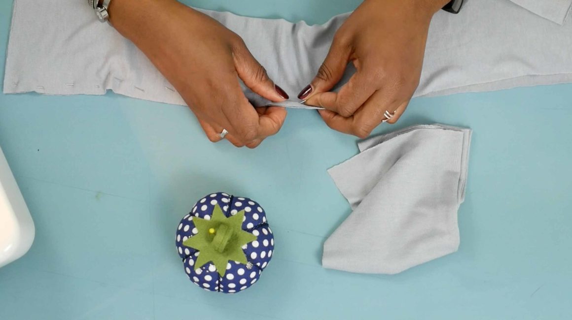 Pliez la bande en deux, dans le sens de la longueur et épinglez tout le long pour empêcher le jersey de bouger pendant la couture.