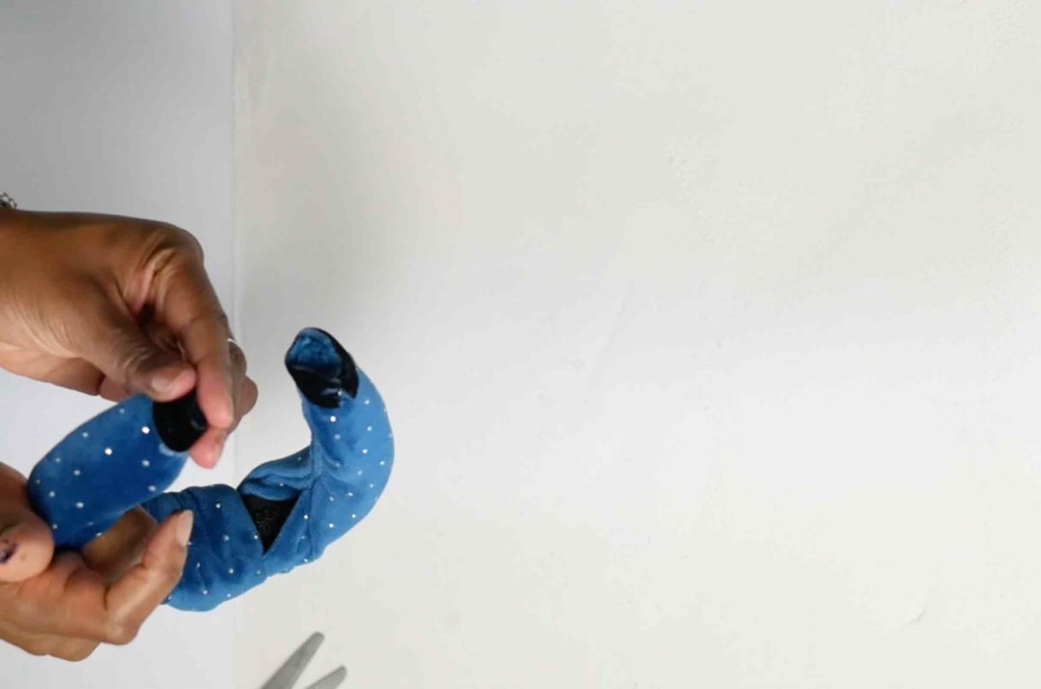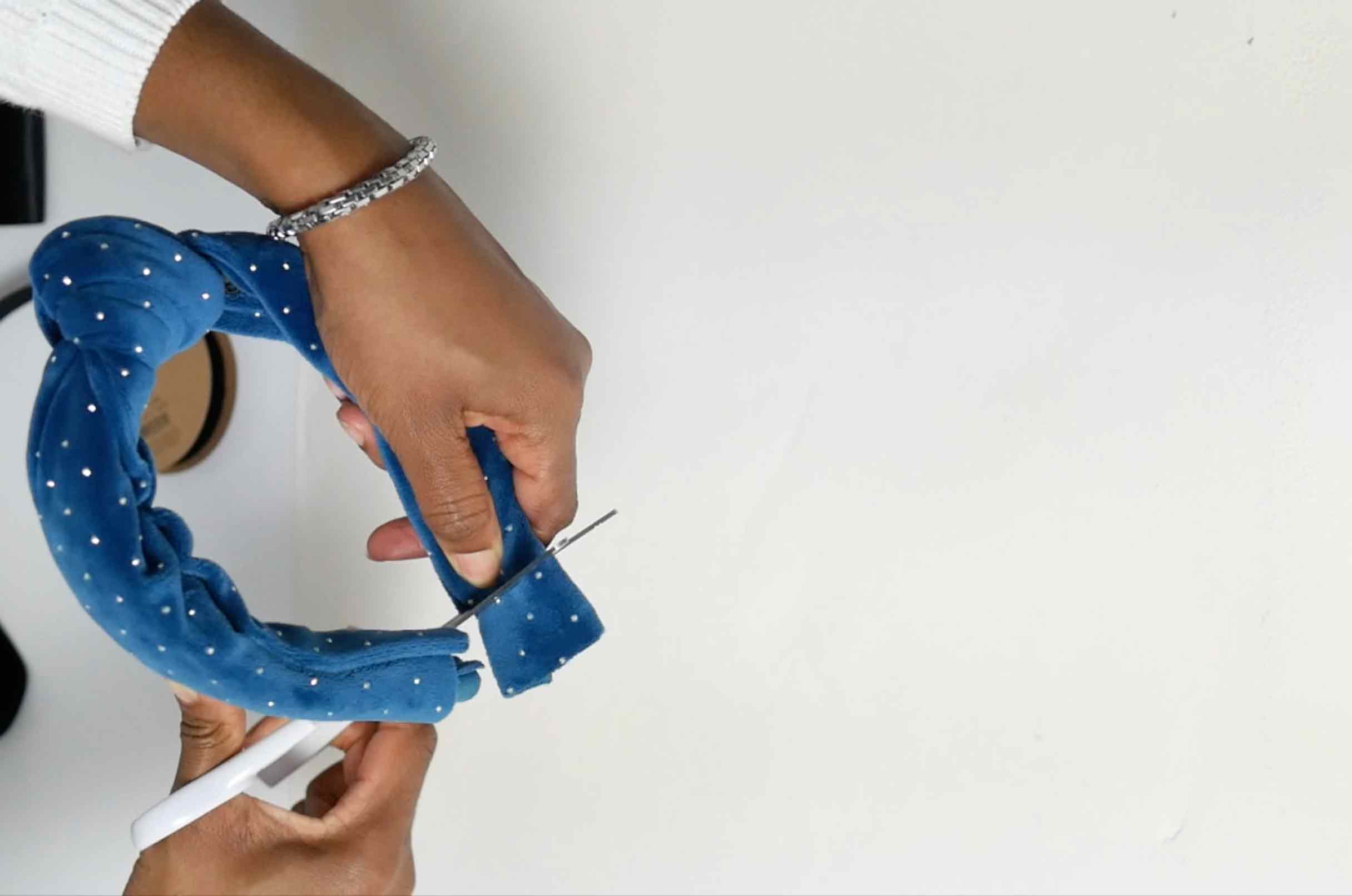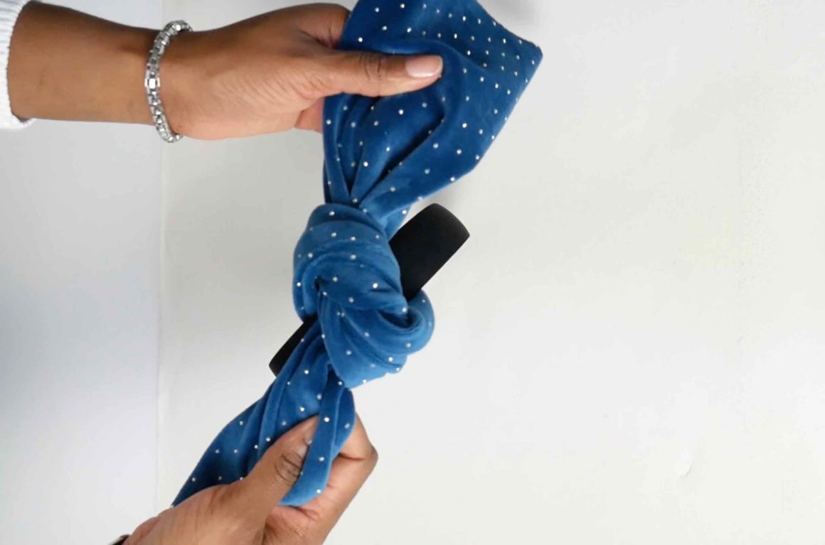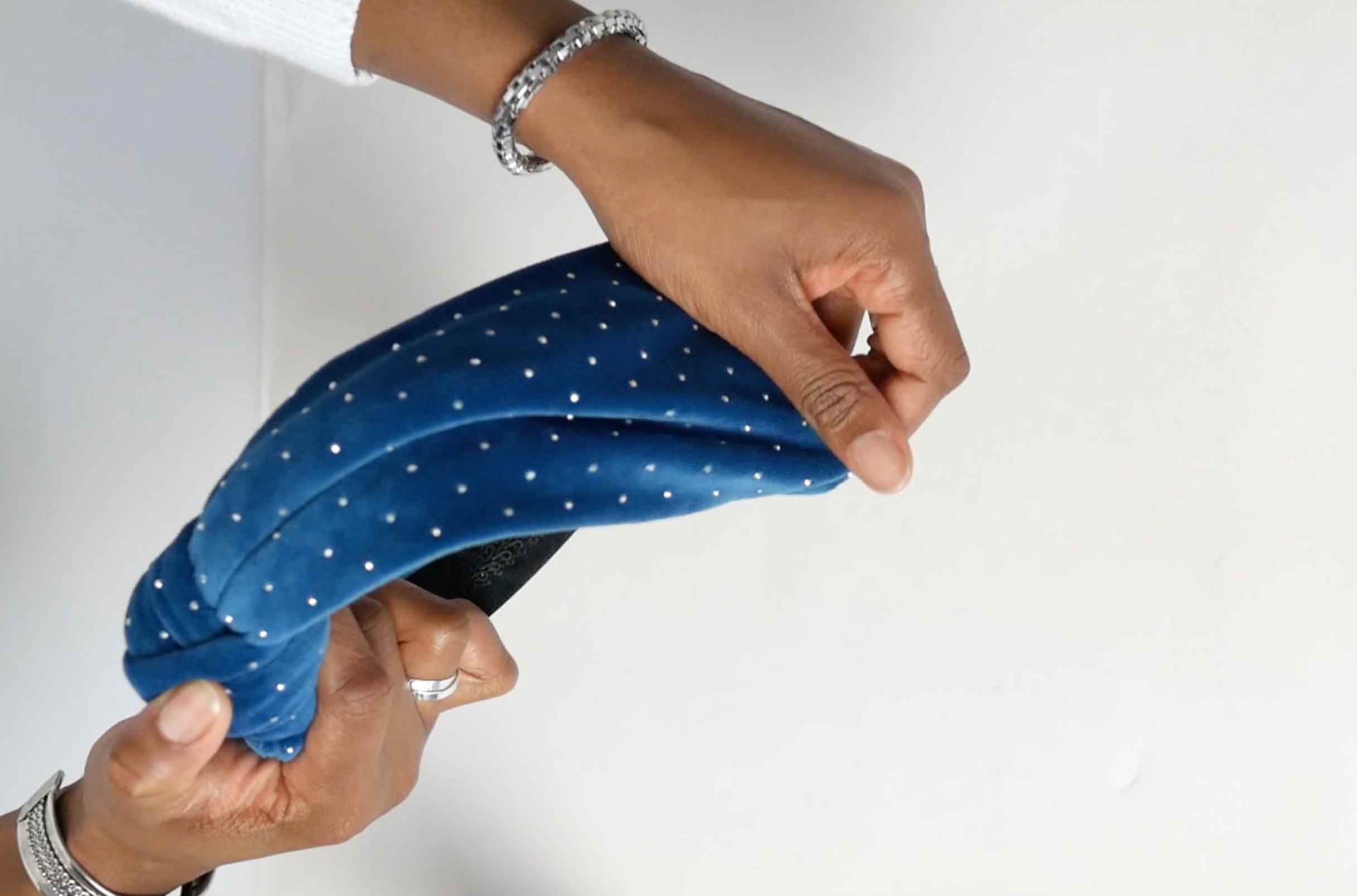 Pour finir, placez le autour de l’extrémité du serre-tête, en pinçant bien le bout pour que le tissu ne soit plus visible.