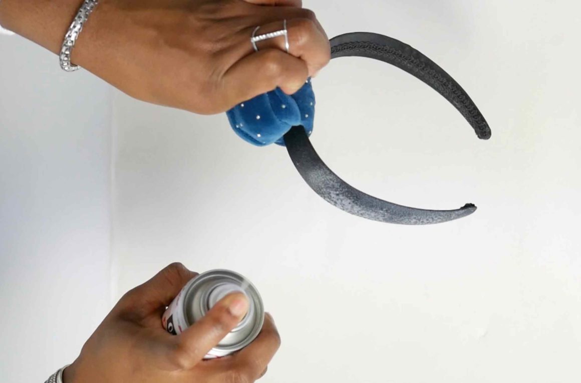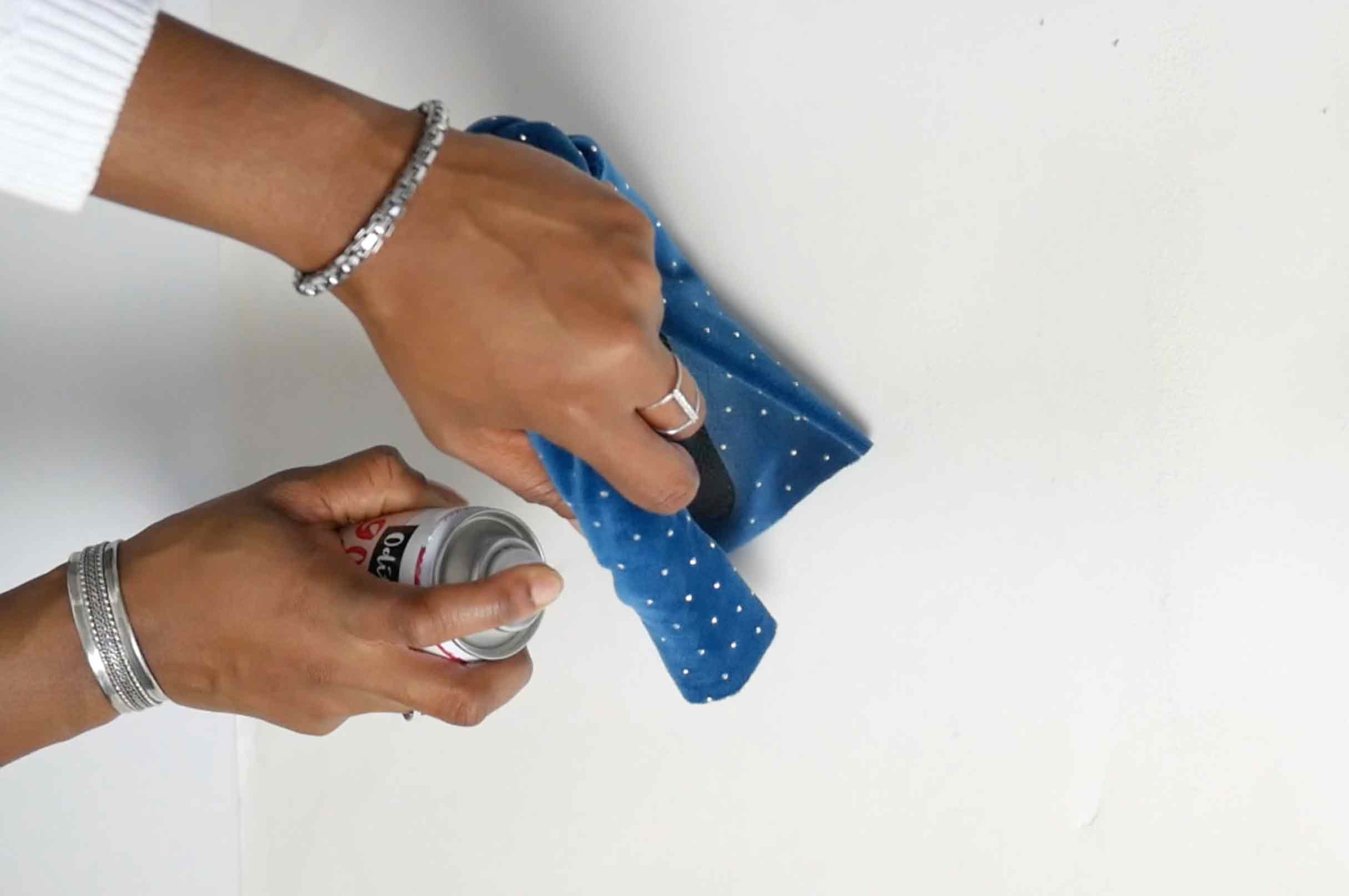 En maintenant le tissu pour ne pas en mettre partout, vaporisez de la colle spray sur l’un des bords extérieur du serre-tête.