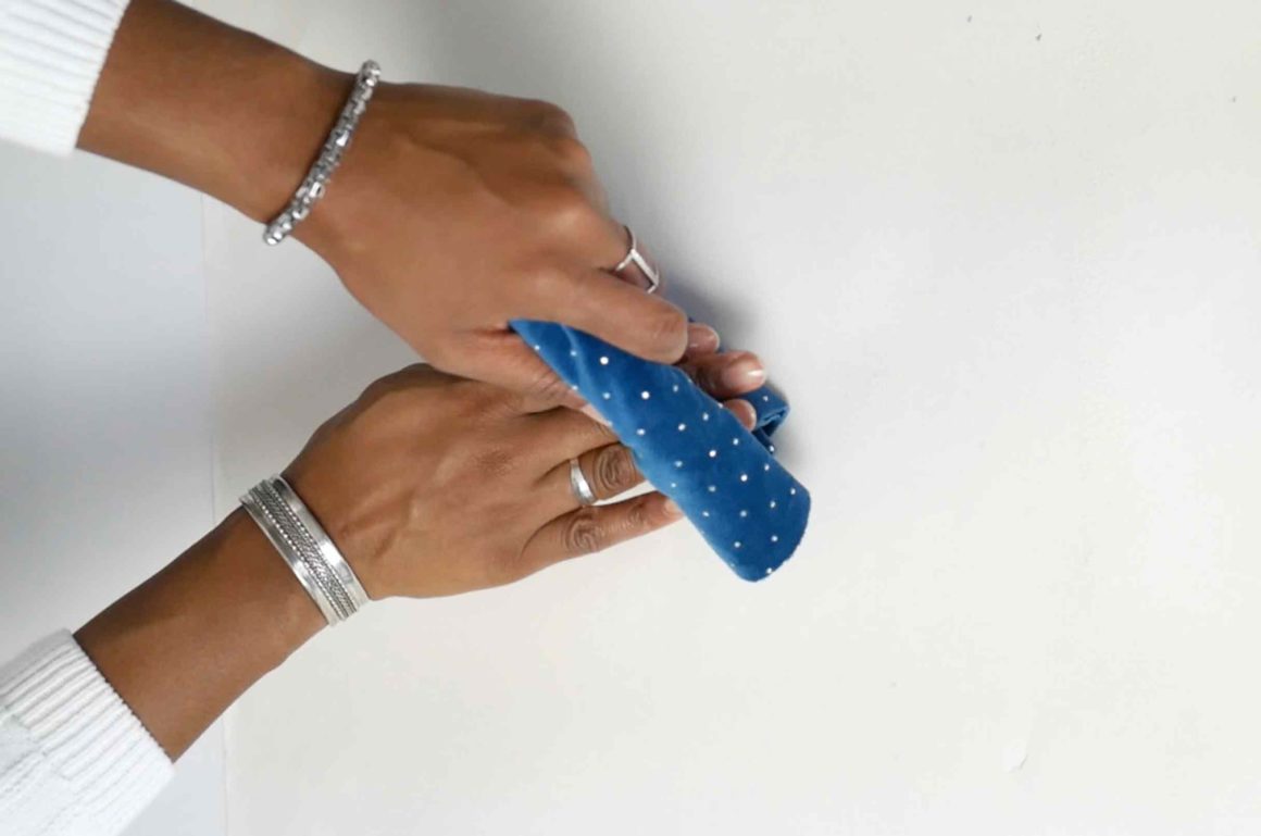A présent, retournez le tissu pour être sur l’endroit. Si vous constatez que la colle n’est pas encore bien sèche, pressez de nouveau les bords et laissez sécher encore quelques minutes.